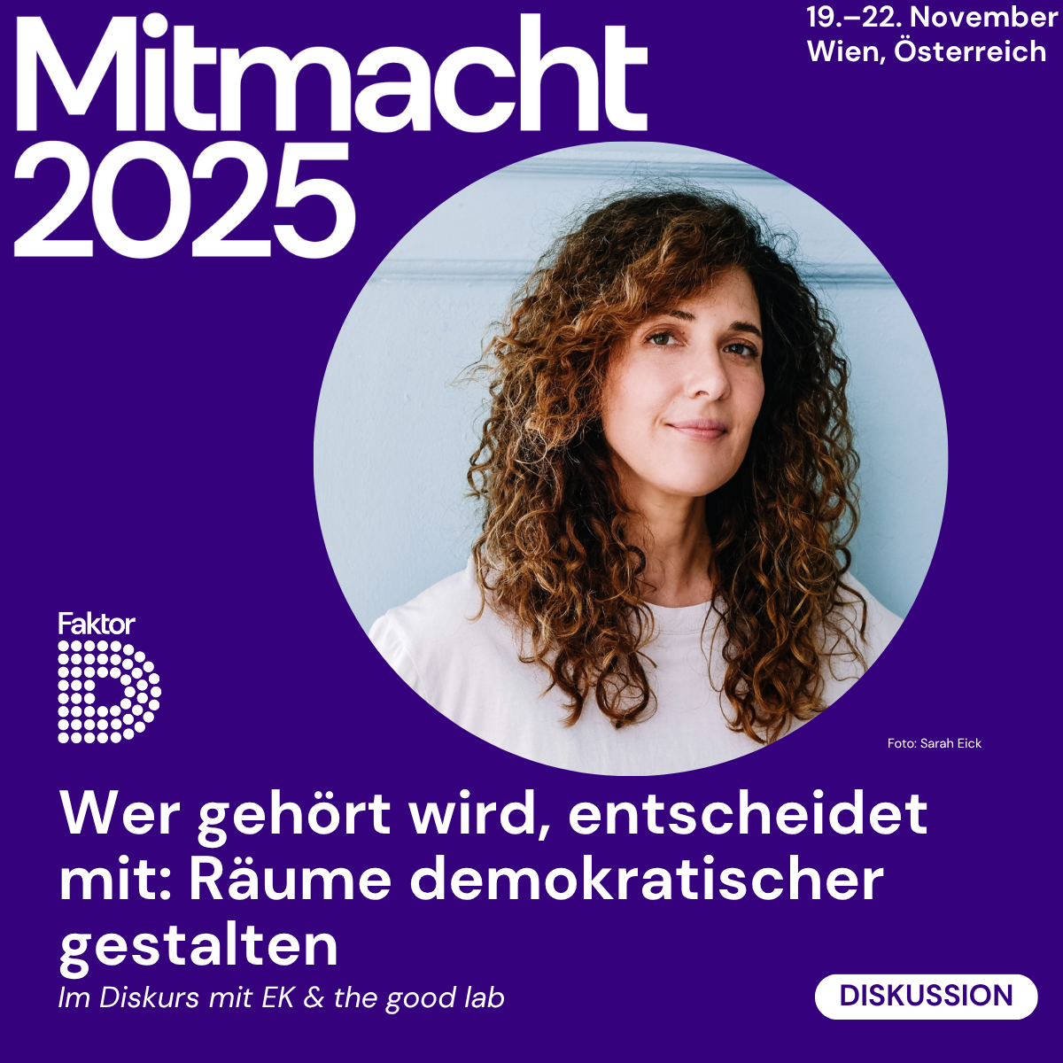 Back in Vienna! Und zwar für das Demokratiefestival „Mitmacht” von Faktor D. Da kommen Expert*innen aus Zivilgesellschaft, Politik, Wissenschaft, Medien und Kultur zusammen, um die Frage zu diskutieren: Wie können wir als demokratische Kräfte gezielter, resilienter und wirksamer zusammenarbeiten? Ich bin mit dem E K & the good lab dabei und spreche am Freitag, dem 21. November 2025, von 11:45 bis 13:00 Uhr mit den Teilnehmenden über das Thema"Wer gehört wird, entscheidet mit: Räume demokratischer gestalten". Es geht um die strukturelle Unsichtbarkeit marginalisierter und kritischer Perspektiven in (algorithmisierten) Konflikträumen. Wir schauen uns unter anderem an, wie Accountable Spaces Schutz und verantwortungsvolle Aushandlung verbinden können – als Gegenentwurf zur reinen Sichtbarkeitslogik. Ich freue mich darauf!